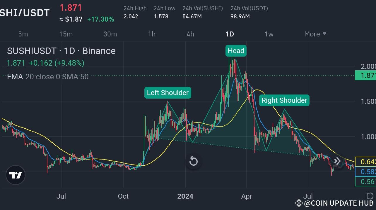 SUSHI sta attualmente negoziando a $1.871 (+9.48%), mostrando un rimbalzo dai recenti minimi. Tuttavia, l'azione del prezzo rimane cauta mentre i trader valutano le implicazioni della formazione di Testa e Spalle.