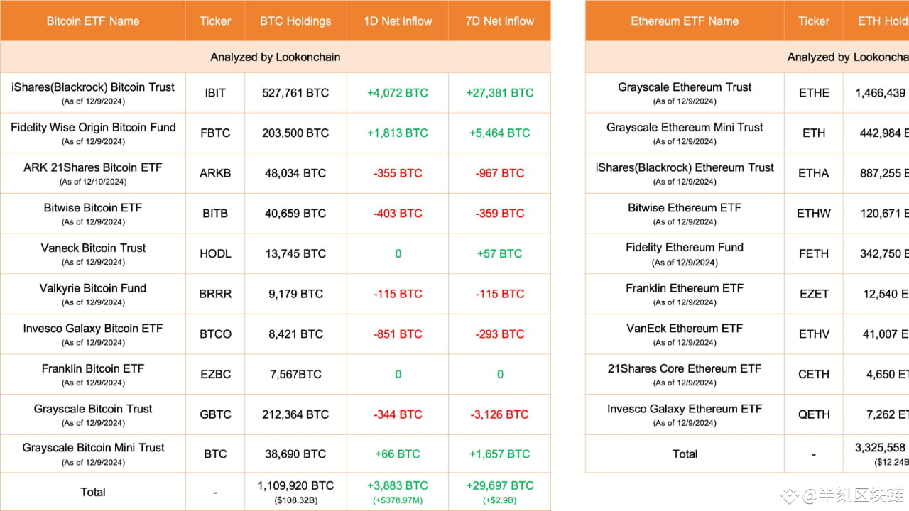 10 Flusso netto degli ETF Bitcoin: +3,883 $BTC (+378.97 milioni di dollari) #BlackRock ha affluenze di 4,072 $BTC (397.37 milioni di dollari), attualmente detiene 527,761 $BTC (5.15 miliardi di dollari).