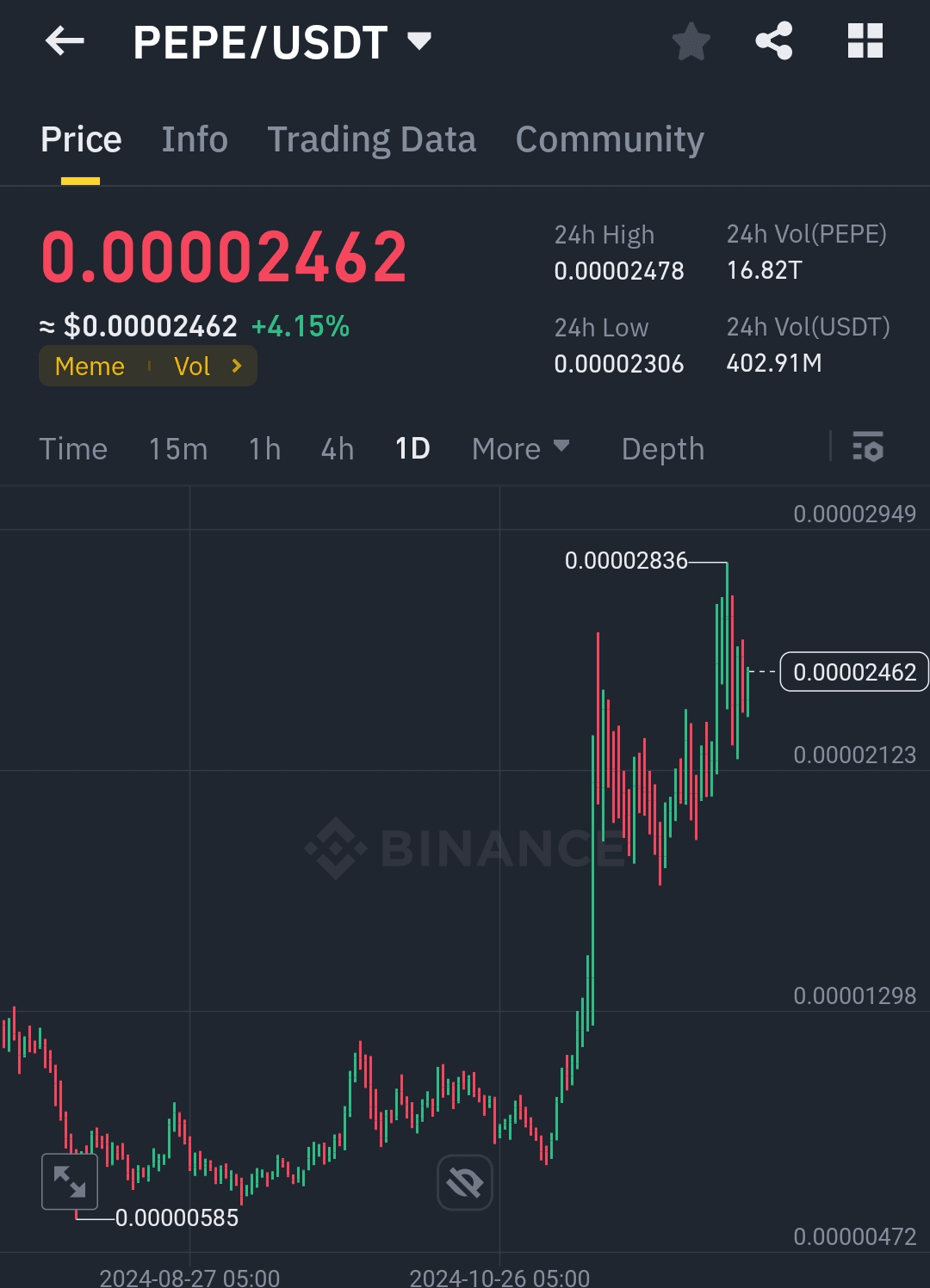 Pepe Coin (PEPE) ha recentemente attirato un'attenzione significativa nel mercato delle criptovalute, in particolare tra i token basati su meme. Le sue prestazioni sono state notevoli, con un volume di trading di 24 ore di circa $7.6 miliardi e un prezzo attuale di $0.000027, segnando un aumento del 152.30% negli ultimi 30 giorni.