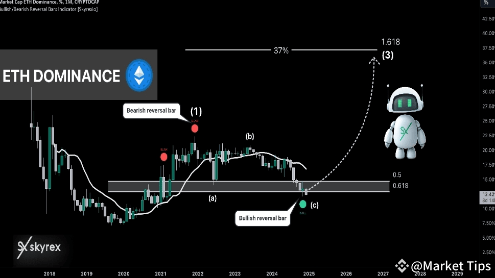 Diamo un'occhiata al timeframe mensile. Dalla precedente corsa al rialzo, la dominanza di ETH è in una grande correzione. La crescita precedente possiamo contarla come la onda 1 che è finita con il punto rosso sull'Indicatore di Inversione Bullish/Bearish [Skyrexio]. Come sempre, gli avvisi da questo indicatore vengono replicati automaticamente sui miei account. Puoi trovare le informazioni nel nostro articolo su TradingView.