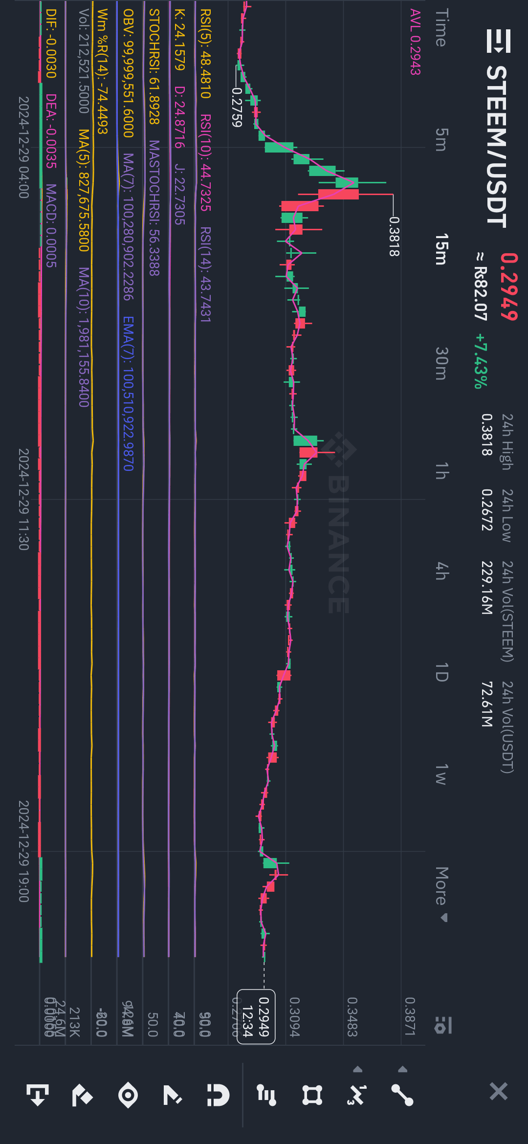 Questo grafico rappresenta la coppia di trading STEEM/USDT su Binance, mostrando molteplici indicatori tecnici e movimento dei prezzi in un grafico a candela. Analizziamolo passo dopo passo: