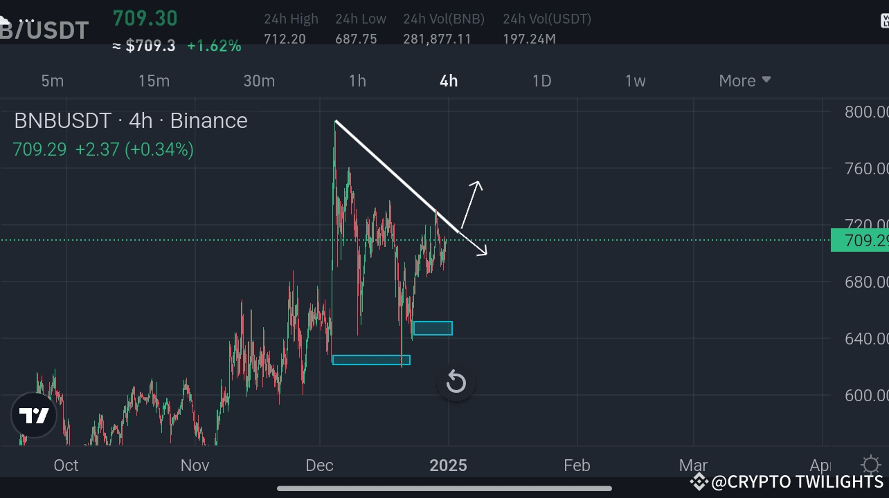 La coppia di trading BNB/USDT è attualmente a $709.29, riflettendo un guadagno modesto di +1.62% nelle ultime 24 ore. Approfondiamo il grafico a 4 ore per analizzare la struttura attuale del mercato e i potenziali movimenti futuri.