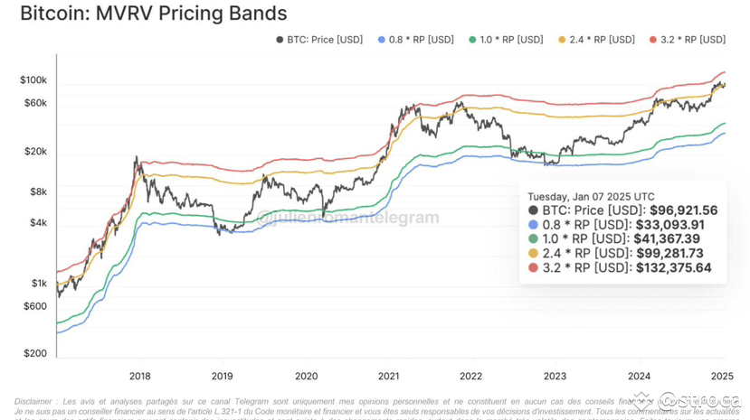 Se i 100.000 dollari (linea gialla) vengono superati, la zona di resistenza successiva su questo indicatore sarà superiore a 132.000 dollari (3,2*RP). Durante le ultime due corse rialziste (2017 e 2021), Bitcoin aveva addirittura ampiamente superato questo livello on-chain...