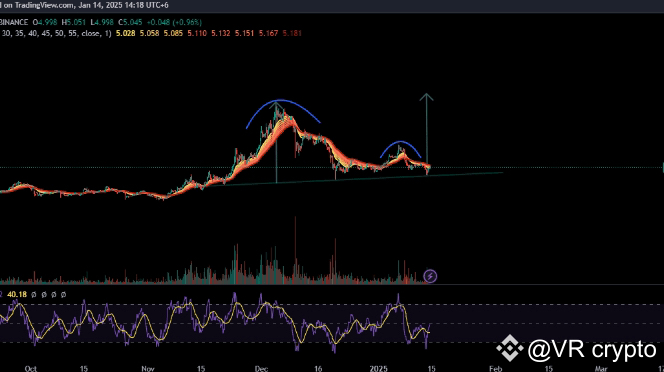 Il grafico EMA indica che il prezzo si sta consolidando vicino al supporto e l'RSI a 48,72 mostra uno slancio neutro, lasciando spazio a un movimento al rialzo. In caso di breakout, il prezzo potrebbe puntare a livelli più alti, intorno ai 6 $ o più, confermando la continuazione del trend rialzista.