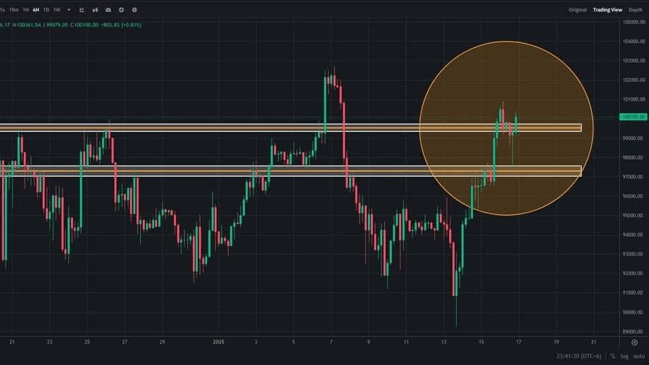 - La zona di resistenza superiore (~$100.000 - $102.000) ha storicamente agito come una forte area di offerta, impedendo a BTC di rompere più in alto nei tentativi passati.