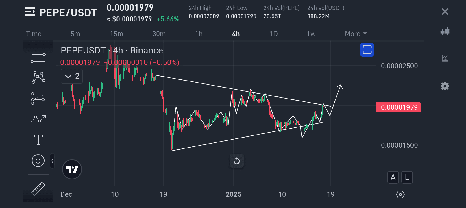 PEPE è stato consolidando all'interno di un triangolo simmetrico, con massimi e minimi crescenti formati nelle ultime settimane.