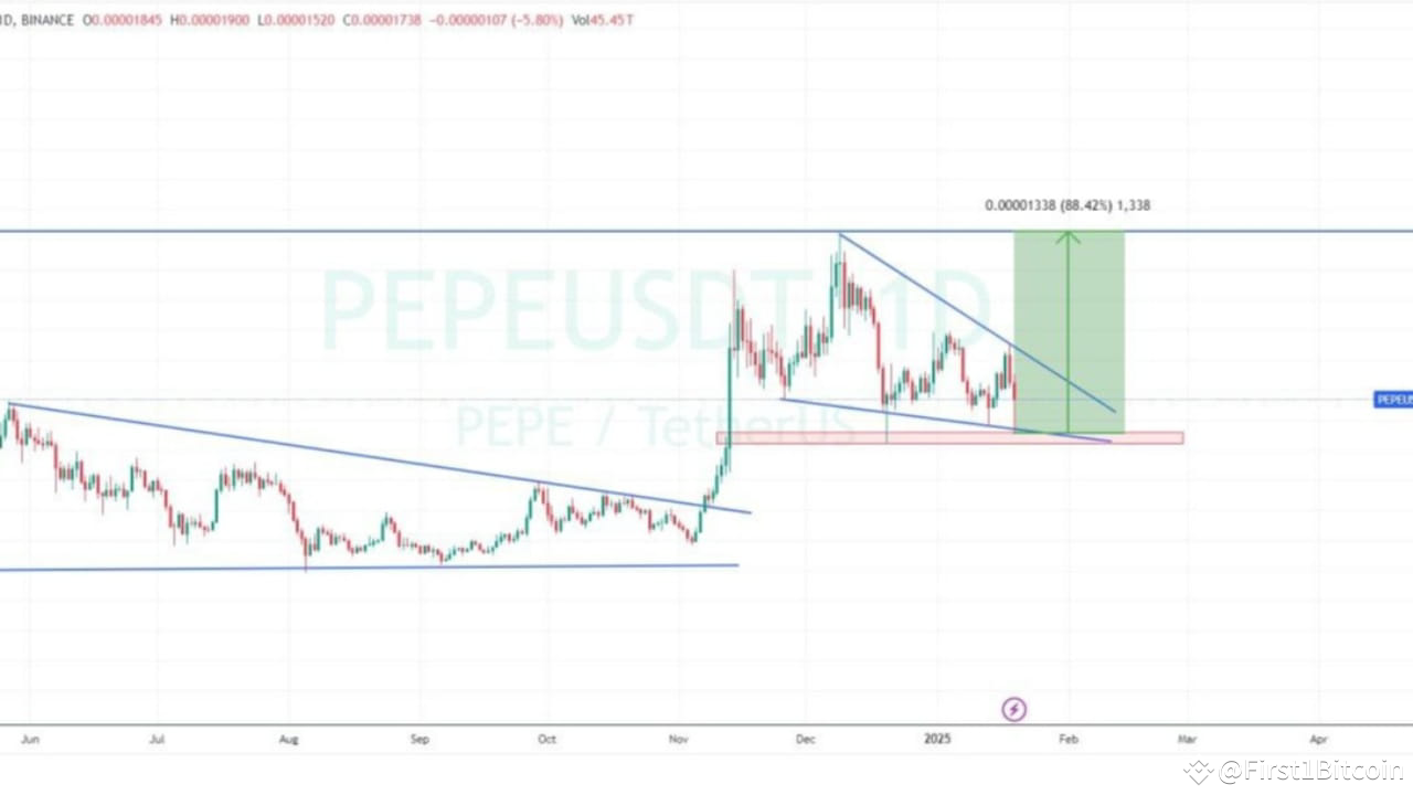 #PEPE sta testando una zona di supporto chiave e formando un modello di breakout rialzista. 📈 Se supera la linea di tendenza discendente, un 88% di guadagno verso la zona obiettivo è possibile! 🚀