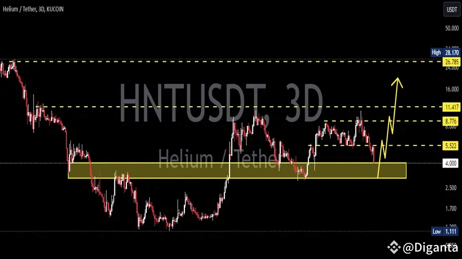 Guardando il timeframe 3D, stiamo vedendo un'azione interessante attorno a un livello di supporto chiave. Questa forte zona di supporto ha retto finora, il che è un segnale ottimistico per HNT.