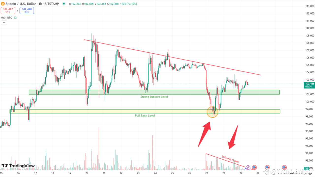 Caso rialzista: se BTC si mantiene sopra il forte livello di supporto con un volume in aumento, potremmo assistere a un proseguimento verso la resistenza.