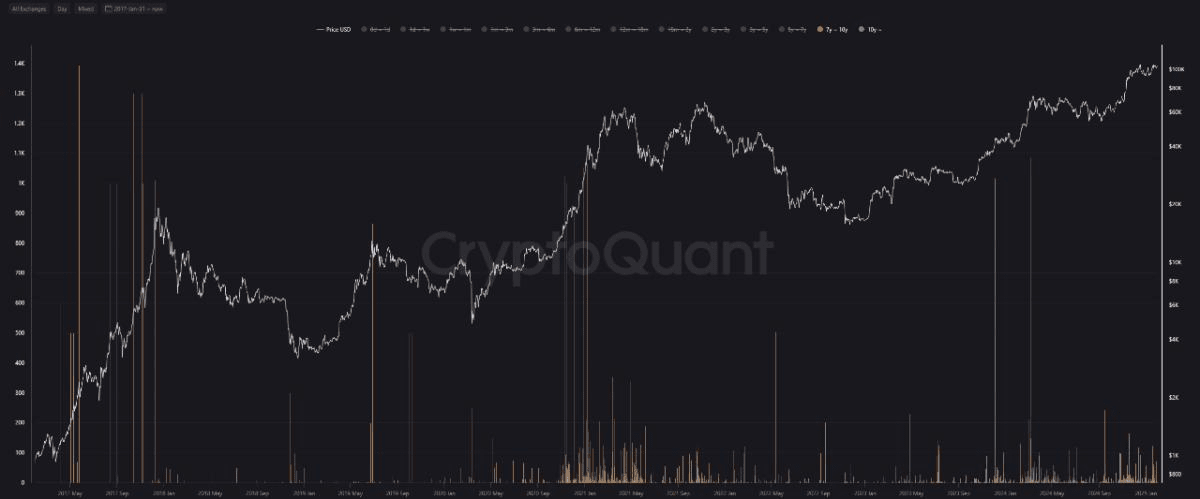 D'altra parte, i possessori a lungo termine—investitori che hanno mantenuto le proprie partecipazioni in Bitcoin per sette anni o più—non hanno mostrato alcuna inclinazione a vendere i propri asset. Un altro analista di CryptoQuant che ha riportato questo in un post sulla piattaforma QuickTake ha notato: