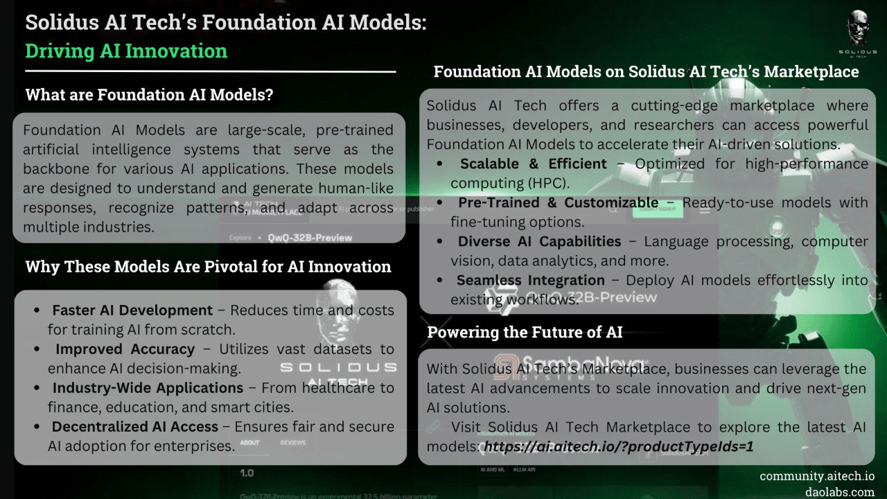 Man mano che la tecnologia AI continua ad evolversi, trovare soluzioni AI ad alte prestazioni che bilanciano efficienza, scalabilità e sicurezza è fondamentale. La mia esperienza con i Modelli AI di Foundation di Solidus AI Tech è stata semplicemente impressionante. Questi modelli sono progettati per fornire a imprese, sviluppatori e ricercatori capacità AI all'avanguardia, consentendo loro di integrare intelligenza avanzata senza soluzione di continuità nei loro flussi di lavoro.
