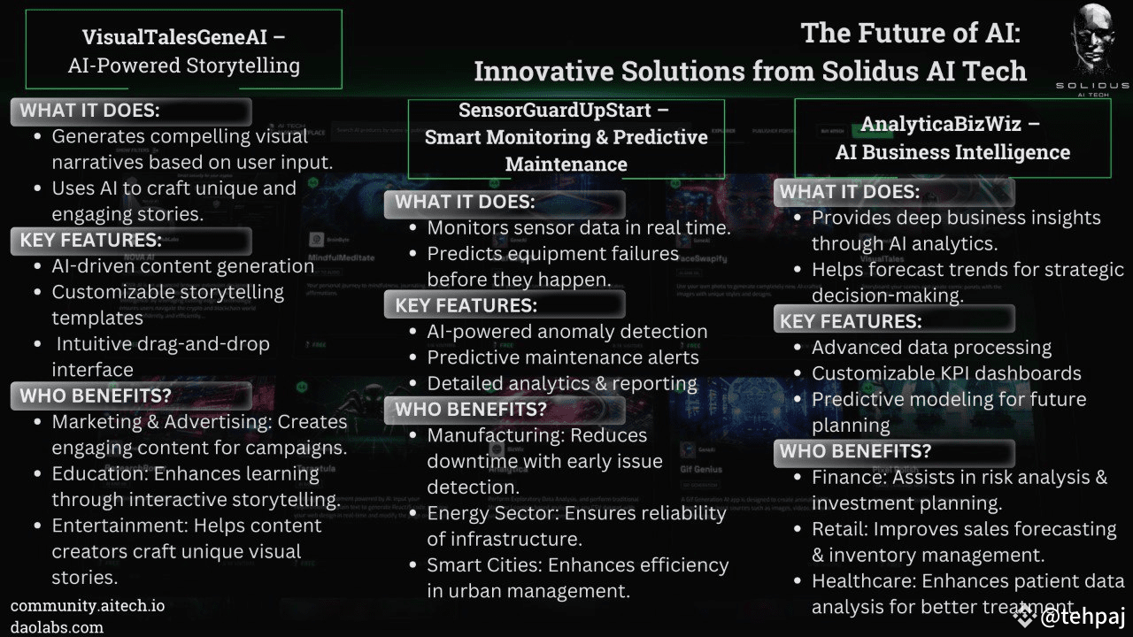 Le innovazioni offerte dal Marketplace di Solidus AI Tech evidenziano il potere trasformativo dell'IA in vari settori. Da VisualTalesGeneAI che migliora la narrazione digitale a SensorGuardUpStart che rivoluziona la manutenzione industriale e AnalyticaBizWiz che ottimizza l'intelligenza aziendale, questi prodotti stanno aprendo la strada a un futuro più intelligente e più efficiente. Le aziende e i professionisti che desiderano sfruttare il potenziale dell'IA possono esplorare queste soluzioni innovative e sbloccare nuovi livelli di produttività e innovazione.
