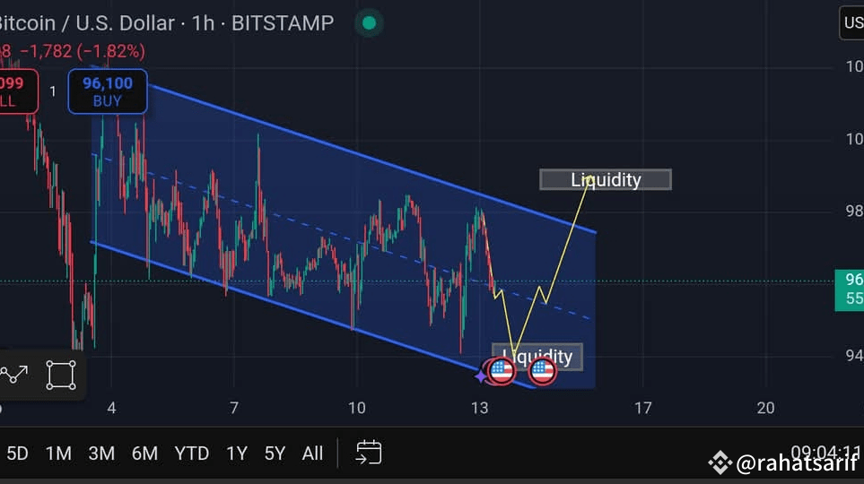 -Obiettivo: La zona di liquidità superiore intorno a $98.000, allineata con la resistenza del canale discendente.
