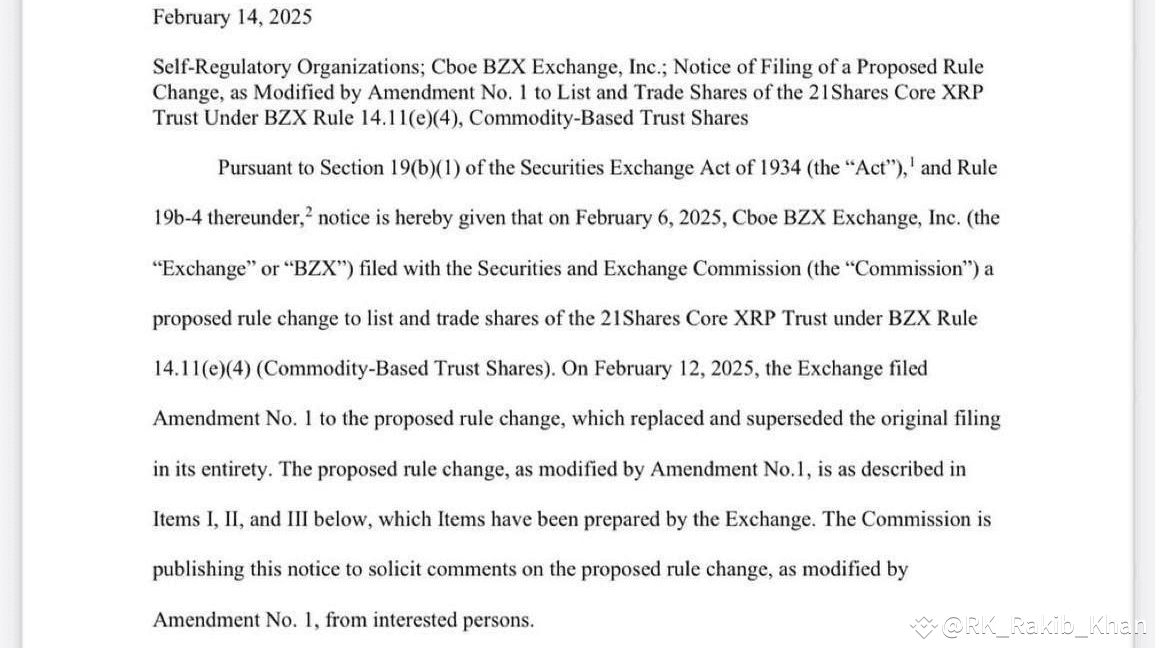 19b-4 di seguito, si avvisa che il 6 febbraio 2025, Cboe BZX Exchange, Inc. (l' "Exchange" o "BZX") ha presentato alla Securities and Exchange Commission (la "Commissione") una proposta di modifica della regola per quotare e scambiare azioni del 21Shares Core XRP Trust ai sensi della Regola BZX 14.11(e)(4) (Azioni di Trust Basate su Merci). Il 12 febbraio 2025, l'Exchange ha presentato l'Ammendamento n. 1 alla proposta di modifica della regola, che ha sostituito e superato la presentazione originale nella sua interezza. La proposta di modifica della regola, come modificata dall'Ammendamento n. 1, è come descritto negli Elementi I, II e III di seguito, che sono stati preparati dall'Exchange. La Commissione pubblica questo avviso per sollecitare commenti sulla proposta di modifica della regola, come modificata da