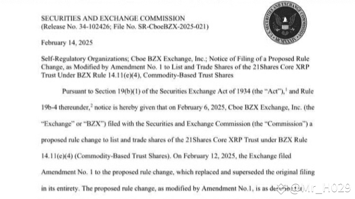 Il 14 febbraio 2025, la Commissione ha rivelato un deposito del Cboe BZX Exchange che proponeva di quotare e negoziare azioni del 21Shares Core XRP Trust. Questo trust, formato nel giugno 2024, è progettato per detenere XRP come asset primario, aprendo la strada all'esposizione regolamentata a una delle criptovalute più chiacchierate.