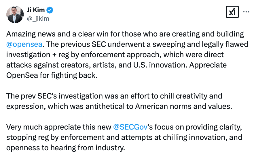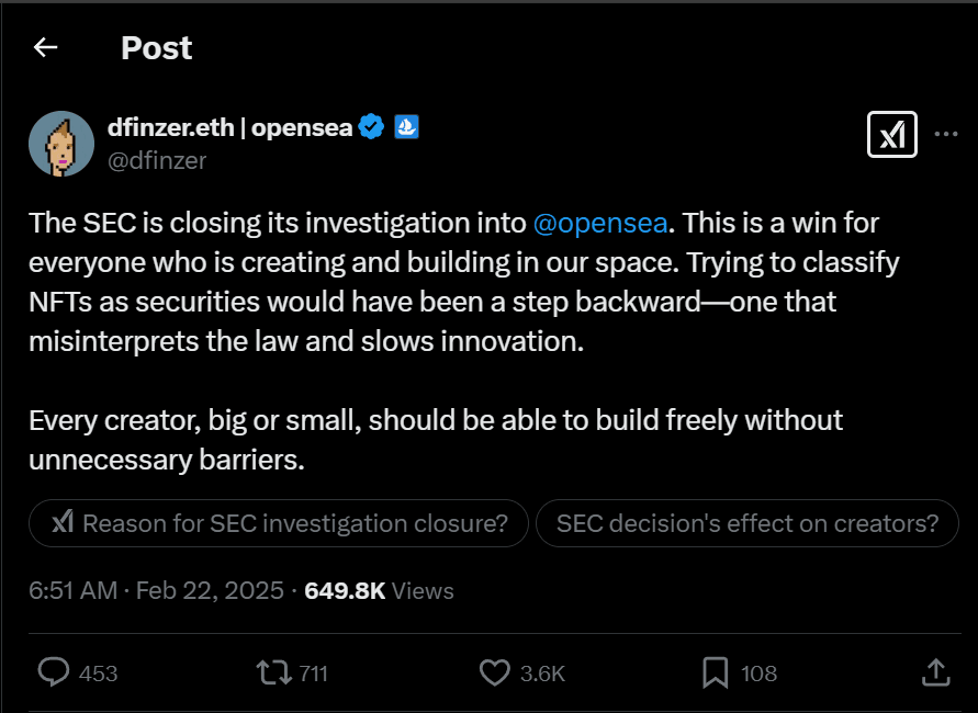 Nel suo ultimo annuncio, la SEC ha confermato che non intende intraprendere alcuna azione legale contro OpenSea, nonostante il presunto elenco precedente di titoli non registrati come NFT da parte della piattaforma. A quel tempo, Devin Finzer, CEO di OpenSea, ha espresso la sua ferma opposizione, dicendo che questo era un colpo alla comunità degli artisti e dei creatori e ha dichiarato la sua disponibilità a confrontarsi con la SEC se necessario.