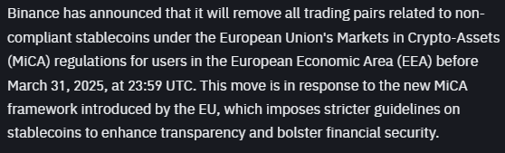 Sviluppi recenti suggeriscono che Binance potrebbe essere in attesa di quotare il token nativo di Pi Network a causa di problemi di conformità con il processo KYB (Know Your Business) di Pi. Questa speculazione si allinea con le recenti azioni di Binance sotto le normative MiCA dell'UE, dove hanno annunciato la rimozione di tutte le coppie di trading di stablecoin non conformi entro il 31 marzo 2025.