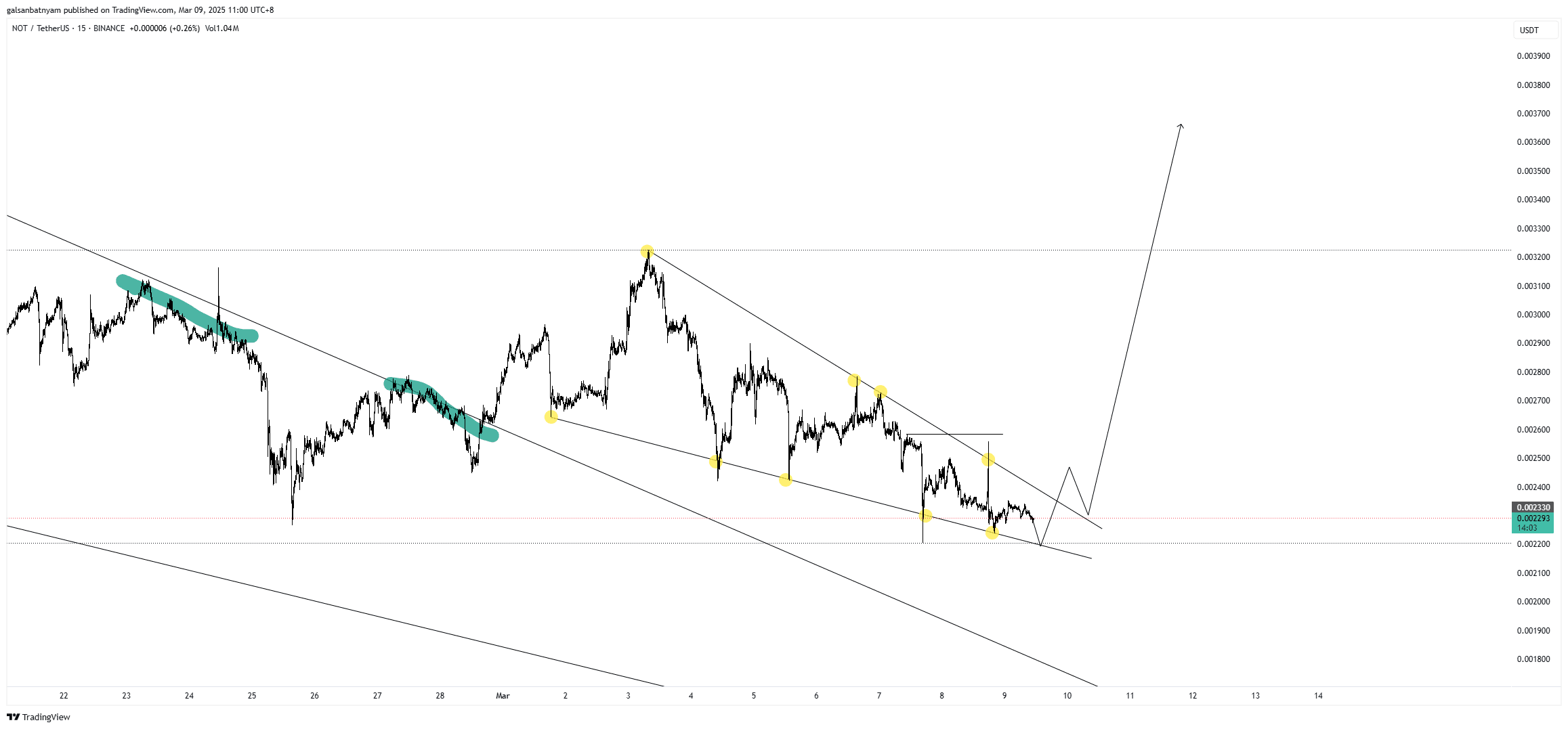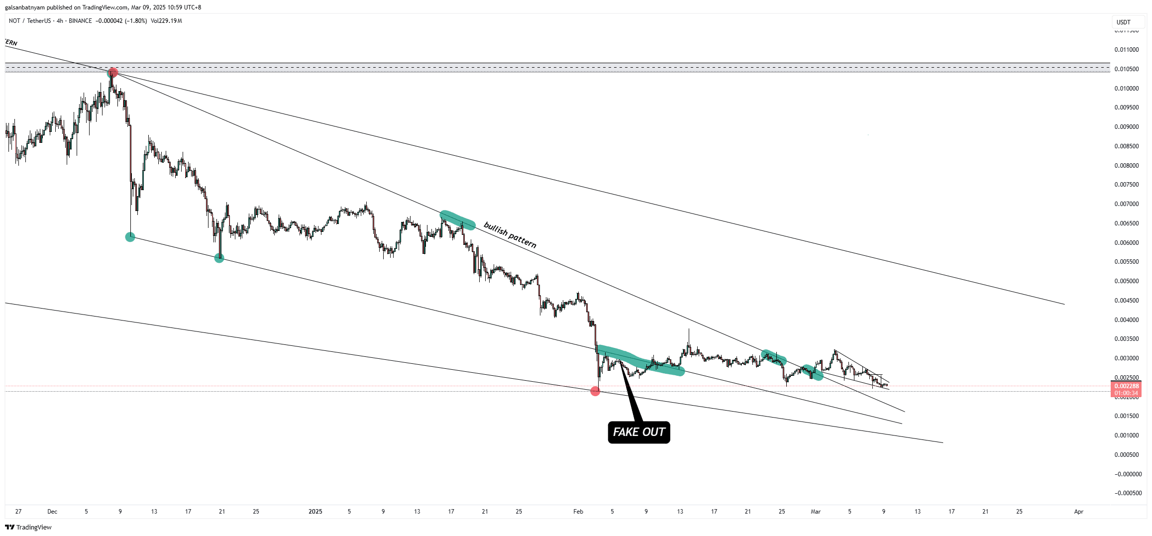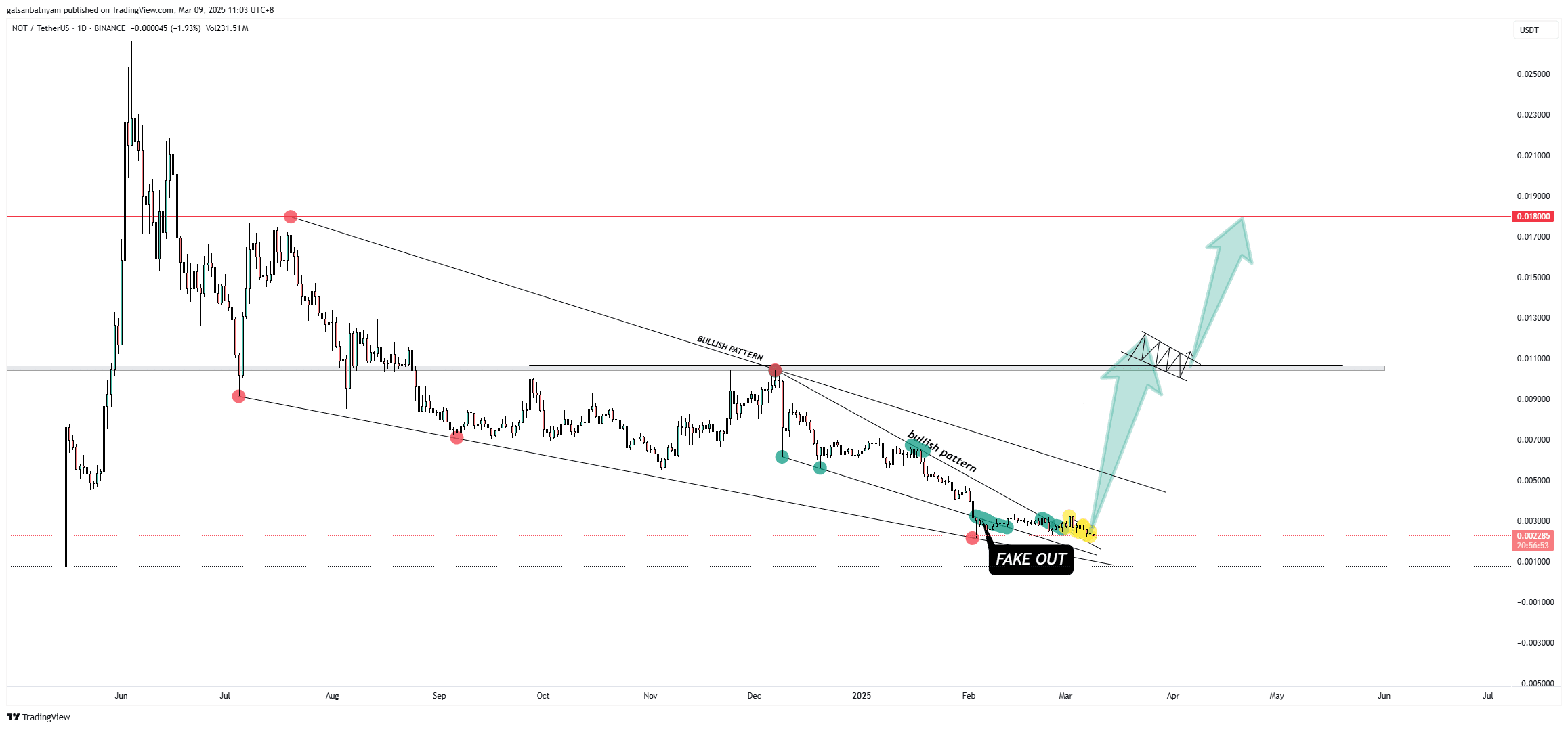 "NOTUSD" potrebbe essere all'inizio di un momento rialzista. È sceso dell'88% dall'ultimo massimo di giugno 2024. Penso che la tendenza al ribasso si stia invertendo ora e ha un potenziale rialzista del 700%, puntando a $0.018. Le timeframe superiori e inferiori sono tutte rialziste ora."