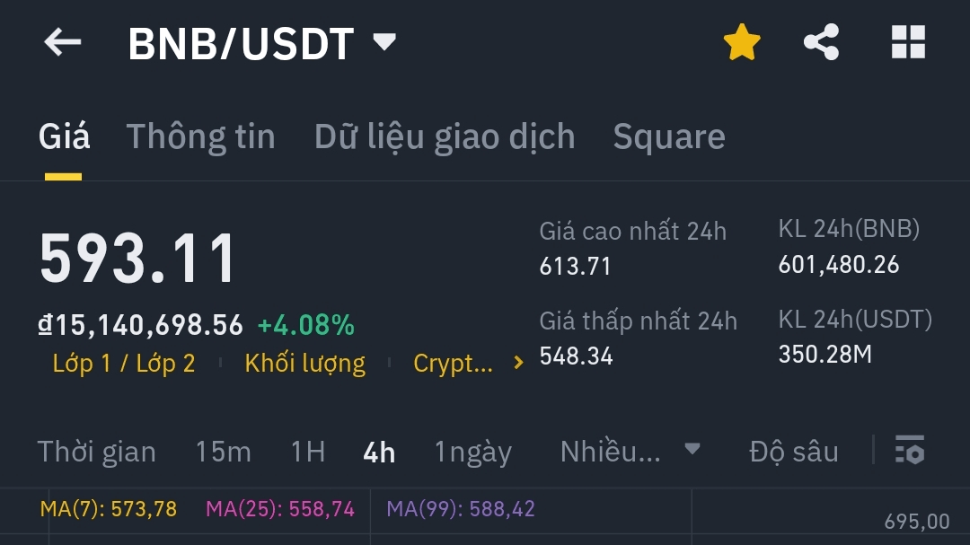 - Prezzo attuale: Secondo i dati di CoinMarketCap, il prezzo di BNB oggi è di circa 18.148.903 VND (equivalente a circa 719 USD, basato su un tasso di cambio di 1 USD ≈ 25.200 VND).