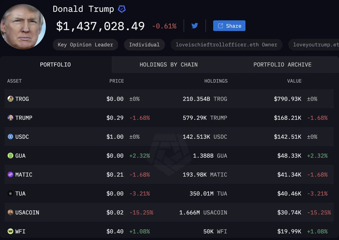 Al momento della scrittura, il portafoglio Arkham Intel mostra crypto per un valore di 1,437 milioni di dollari, inclusi meme coin e stablecoin, token come Polygon matic-2.02%Polygon e il token WFI di World Liberty Financial.