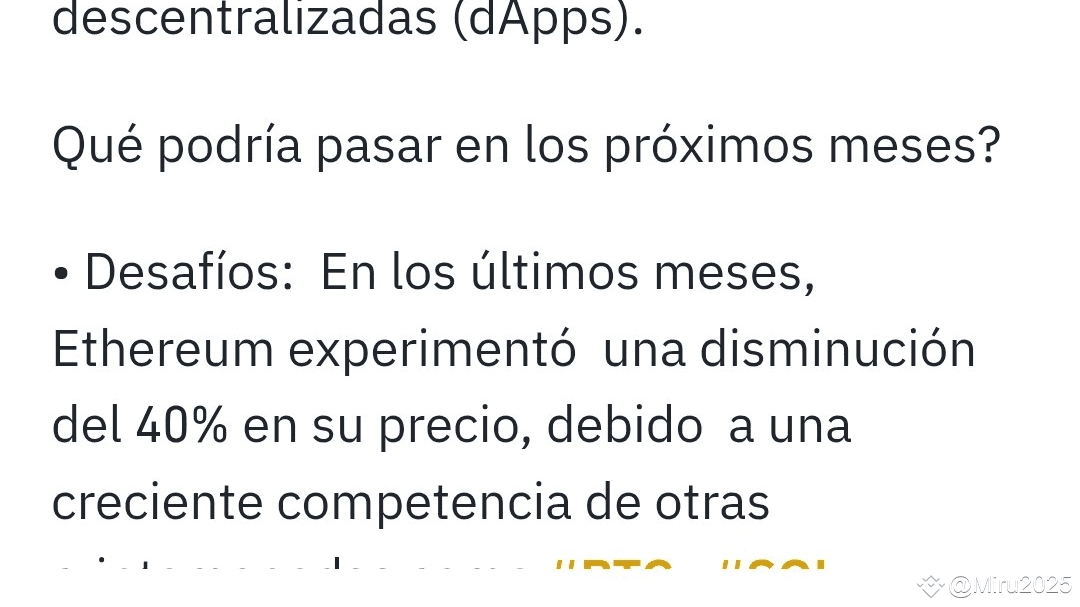 • Sfide: Negli ultimi mesi, Ethereum ha subito una diminuzione del 40% nel suo prezzo, a causa di una crescente concorrenza di altre criptovalute come #BTC , #SOL e #CARDANO . Così come a fattori come la popolarità dei memecoins e la decisione dell'amministrazione Trump di non acquisire #ETH per la sua riserva di criptovalute. Sviluppi tecnici interni e ritardi hanno anche contribuito a questa situazione.