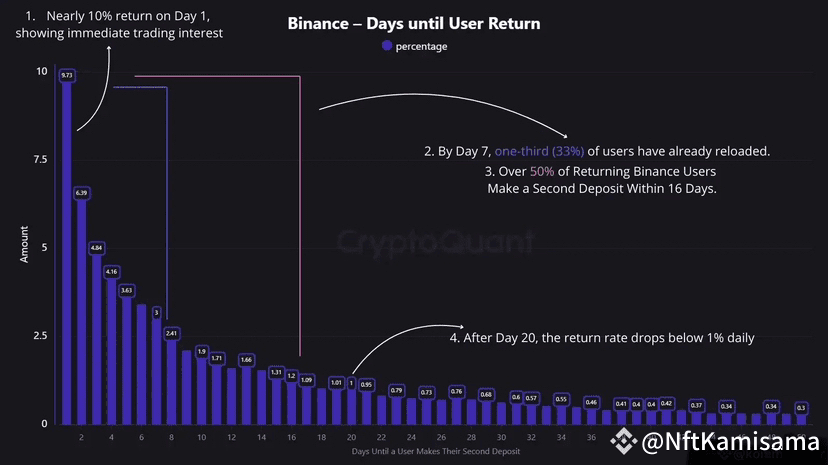 In aggiunta, un terzo dei clienti che tornano ricarica i propri conti entro il settimo giorno. Questo schema sottolinea l'idea che Binance è un magnete per i trader ripetitivi. È come un mercato affollato dove i trader vanno e vengono, cercando costantemente la prossima grande opportunità.