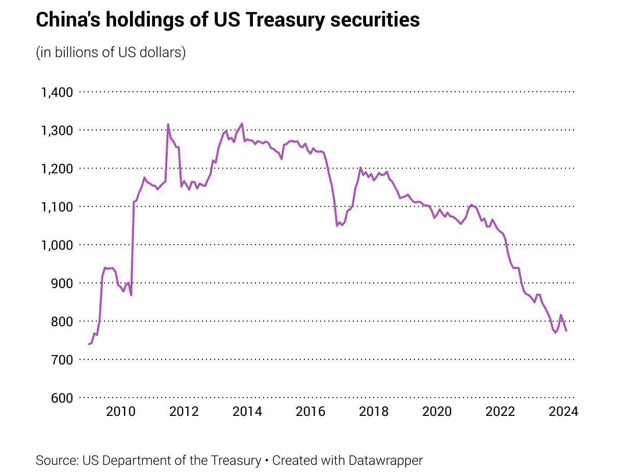 - **$22.7B in Titoli di Stato statunitensi venduti a febbraio 2025**—le detenzioni della Cina ora a **$775B**, il livello più basso dal 2009.