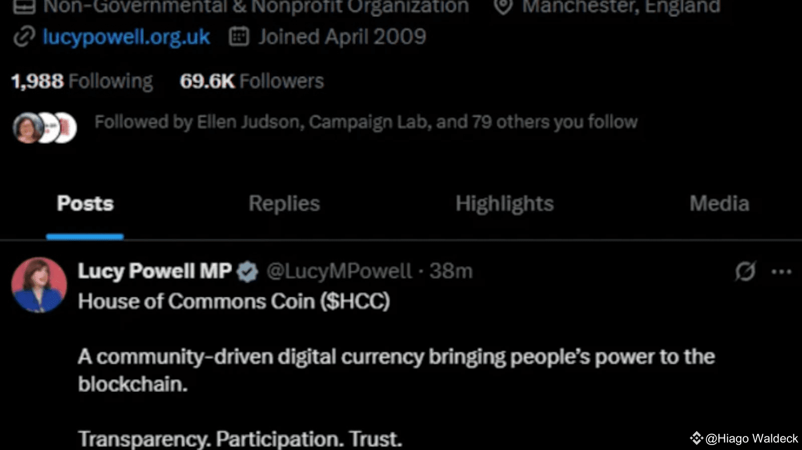 L'account di Lucy Powell, ministra e leader della Camera dei Comuni del Regno Unito, è stato violato per promuovere una falsa criptovaluta chiamata "$HCC", suppostamente legata al Parlamento britannico. Gli hacker hanno pubblicato messaggi che descrivevano la moneta come "una criptovaluta guidata dalla comunità" con "trasparenza, partecipazione e fiducia", utilizzando anche il logo ufficiale della Camera dei Comuni.
