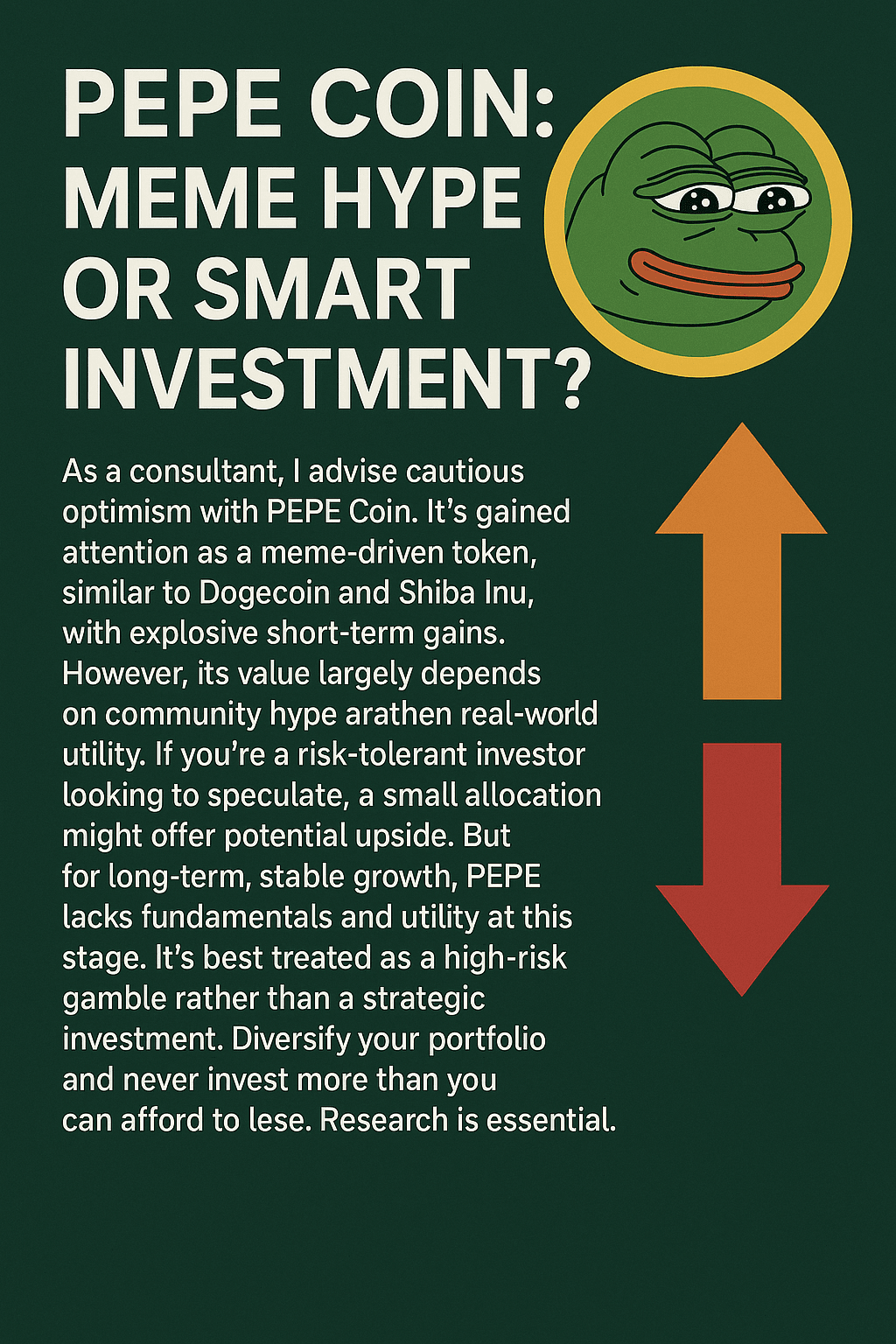 In qualità di consulente, consiglio un ottimismo cauto con PEPE Coin. Ha attirato l'attenzione come un token guidato dai meme, simile a Dogecoin e Shiba Inu, con guadagni esplosivi a breve termine. Tuttavia, il suo valore dipende in gran parte dall'hype della comunità piuttosto che da un'utilità reale. Se sei un investitore con una tolleranza al rischio che cerca di speculare, una piccola allocazione potrebbe offrire un potenziale rialzo. Ma per una crescita stabile a lungo termine, PEPE manca di fondamentali e utilità in questa fase. È meglio trattarlo come una scommessa ad alto rischio piuttosto che come un investimento strategico. Diversifica il tuo portafoglio e non investire mai più di quanto puoi permetterti di perdere. La ricerca è essenziale.