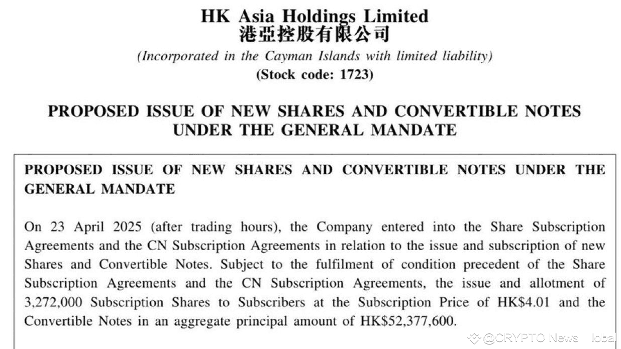 🇭🇰 APPENA IN: HK Asia Holdings prevede di raccogliere HK$65.5M per espandere le sue riserve di #Bitcoin.