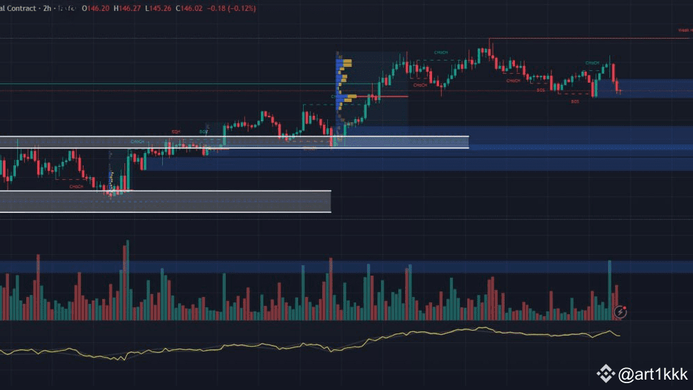 - Modesto aumento del volume sui rimbalzi da 144–146 USDT, mostrando interesse tattico per l'acquisto al ribasso.