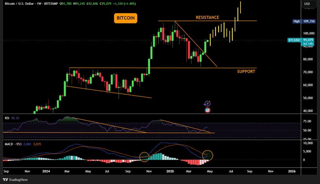 La precedente zona di resistenza intorno a $88,000–$92,000 è stata superata. Bitcoin sta ora puntando al suo prossimo livello chiave a $109,356, e oltre a questo è in modalità di scoperta dei prezzi.