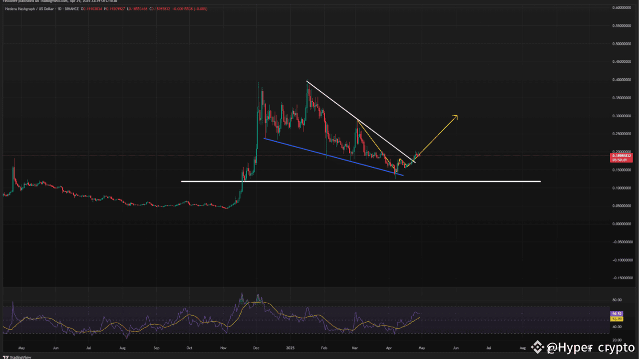 1) Posso vedere che questo è il grafico HBAR a 1 giorno. Il prezzo ha recentemente formato un triangolo discendente ed ora sta rompendo, suggerendo un potenziale inversione rialzista 📈. Il prezzo si sta anche avvicinando a un livello di supporto significativo vicino a 0.1500, che ha tenuto in passato 🔒. L'RSI è attualmente sopra 50, indicando un momento positivo. C'è una rottura rialzista in corso, e il prezzo potrebbe dirigersi verso l'intervallo 0.2500-0.3000 se la tendenza al rialzo continua 🚀.