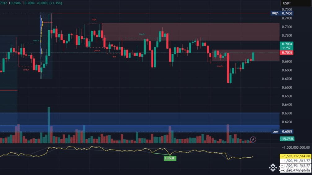 Dopo di che, una serie di CHoCH verso il basso e un chiaro BOS hanno spostato la tendenza al ribasso. Il prezzo si è riequilibrato all'interno della zona di offerta $0.715–0.730 prima di crollare nella regione $0.650–0.670. Gli acquirenti sono riapparsi a quel livello, innescando un recupero che ora sta testando la zona centrale intorno a $0.690–0.700.
