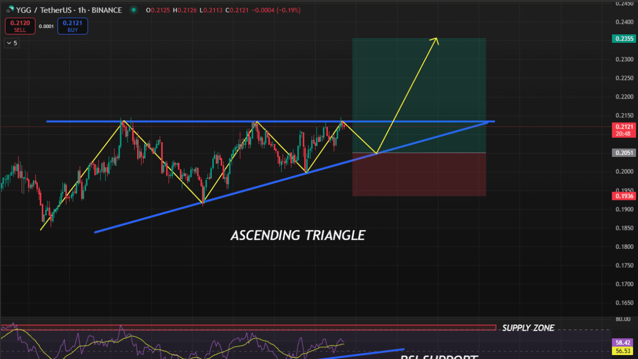 YGG sta formando un triangolo ascendente sul timeframe di 4 ore, che è tipicamente un pattern rialzista. Un breakout sopra la trendline superiore potrebbe innescare un momento di rialzo. Inoltre, l'RSI di 4 ore sembra dirigersi verso la zona di offerta, supportando un potenziale movimento verso l'alto.