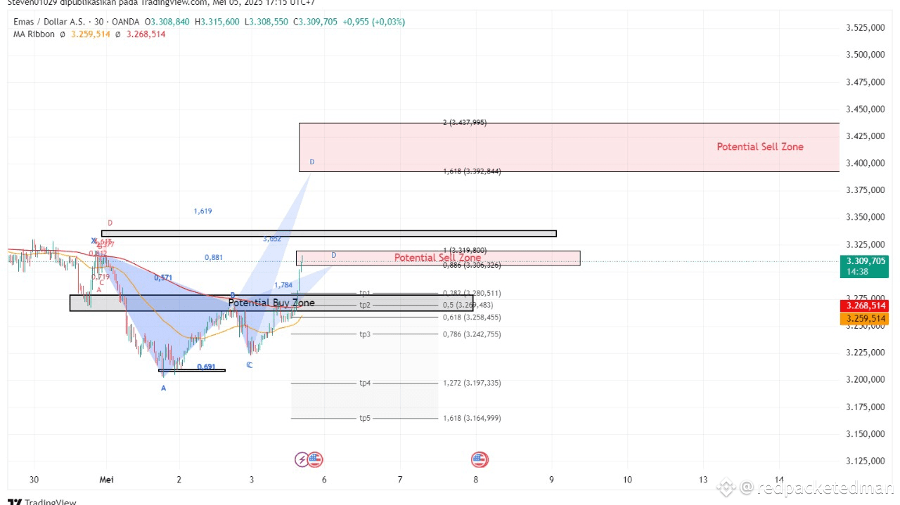 Rilevato un pattern armonico rialzista su XAUUSD (30m) che si è appena completato all'interno della Potenziale Zona di Acquisto, allineandosi perfettamente con la confluenza di Fibonacci e il supporto della MA Ribbon. Il mercato ha reagito con un rimbalzo pulito e si sta avvicinando a una Potenziale Zona di Vendita, che include due punti D armonici: