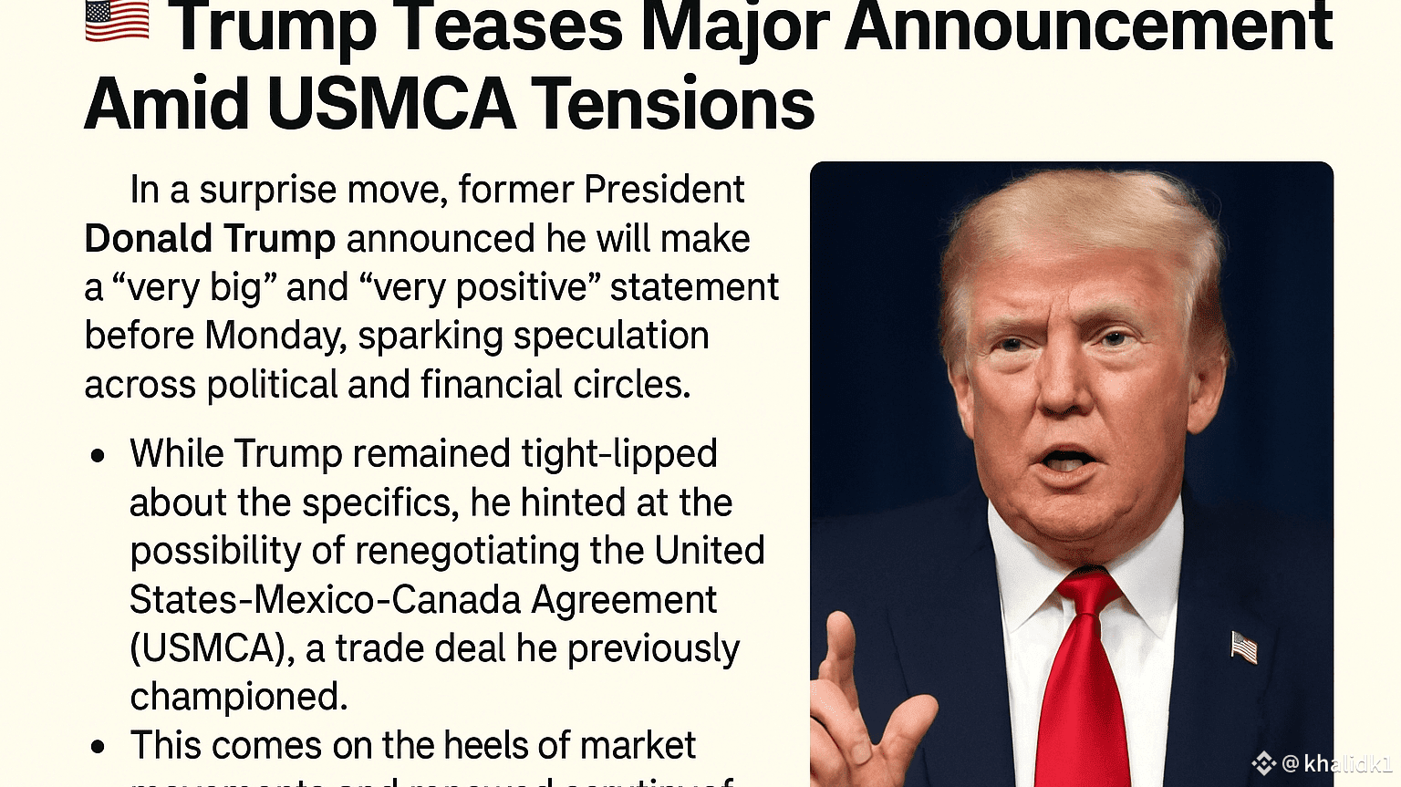 Trump ha anticipato l'annuncio come **"molto positivo"** e ha accennato a qualcosa di **“molto grande.”** Anche se non ha fornito dettagli specifici, ha suggerito che il **USMCA (Accordo Stati Uniti-Messico-Canada)** potrebbe essere soggetto a rinegoziazione—scatenando immediate speculazioni nei mercati finanziari.