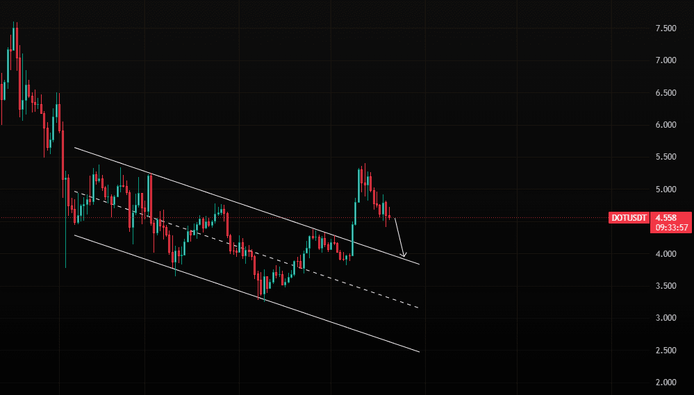 DOT può scendere ulteriormente verso l'area diagonale di supporto che era precedentemente il canale discendente. Poiché l'intero mercato sta per subire una correzione sana a medio termine, possiamo aspettarci che DOT raggiunga l'area che ho contrassegnato. Entrare long prima di ciò sarebbe un gioco da sciocchi.