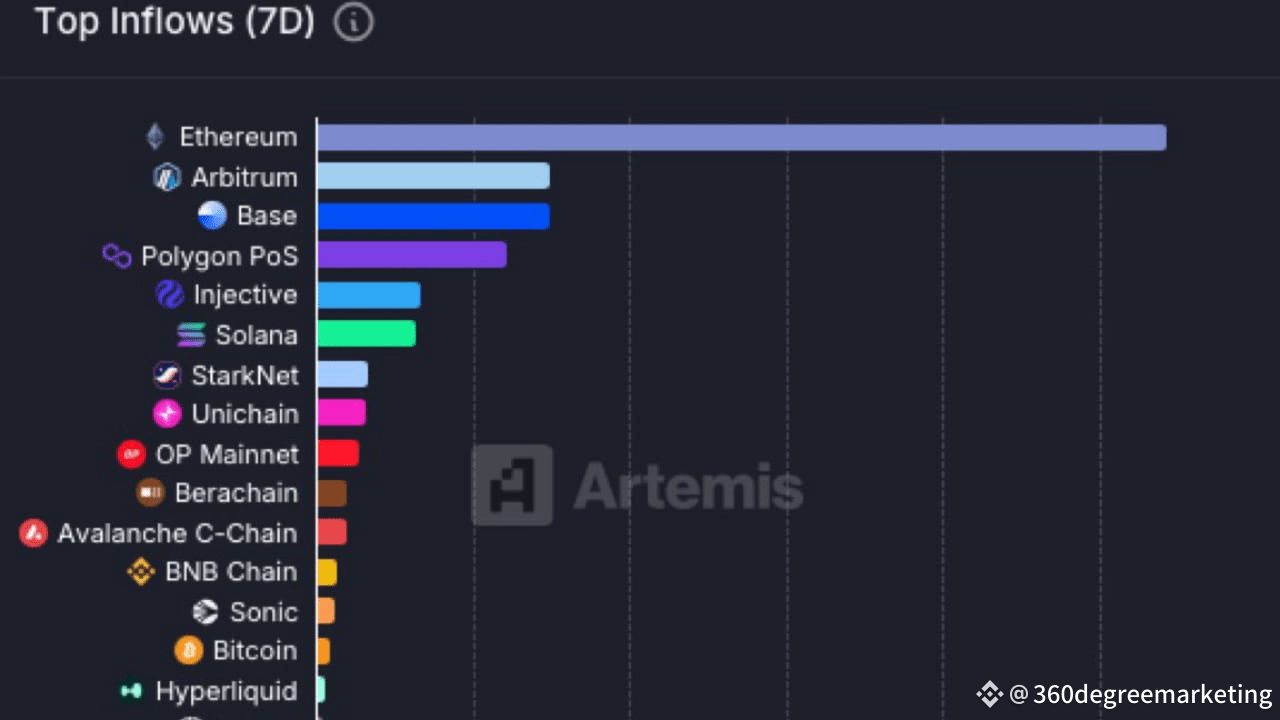 L'1,1 miliardi di dollari di afflussi di Ethereum negli ultimi sette giorni supera di gran lunga il capitale che entra in altri ecosistemi blockchain. Questi dati, provenienti da Artemis, pongono Ethereum come una delle principali destinazioni per i fondi degli investitori.