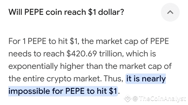 $PEPE è una moneta meme, guidata dall'hype e dal sentimento della comunità, non da un'utilità fondamentale. Sebbene le monete meme possano vedere enormi aumenti, mantenere una valutazione così estrema (un aumento del 7.692.307% rispetto ai suoi attuali $0.000013) è senza precedenti e insostenibile per un progetto senza valore intrinseco o roadmap di sviluppo.