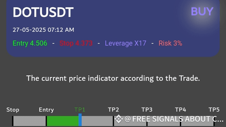 Un nuovo segnale bullish è emerso per DOT/USDT, che rappresenta una grande opportunità per i trader. Questo trade è stato fornito con un segnale di acquisto con Entry a 4.506, Stop Loss a 4.373 e Leverage X17, mentre è stato mantenuto solo un rischio del 3%.