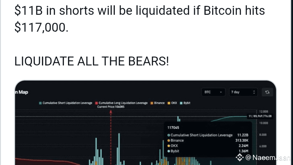 Un enorme $11 miliardi in posizioni short potrebbero essere spazzati via se Bitcoin (BTC) raggiunge il livello di $117.000, secondo gli ultimi dati on-chain e sui derivati. Questo potenziale livello di liquidazione ha suscitato intense discussioni tra trader e analisti, poiché rappresenta un importante traguardo psicologico e tecnico per il mercato delle criptovalute.
