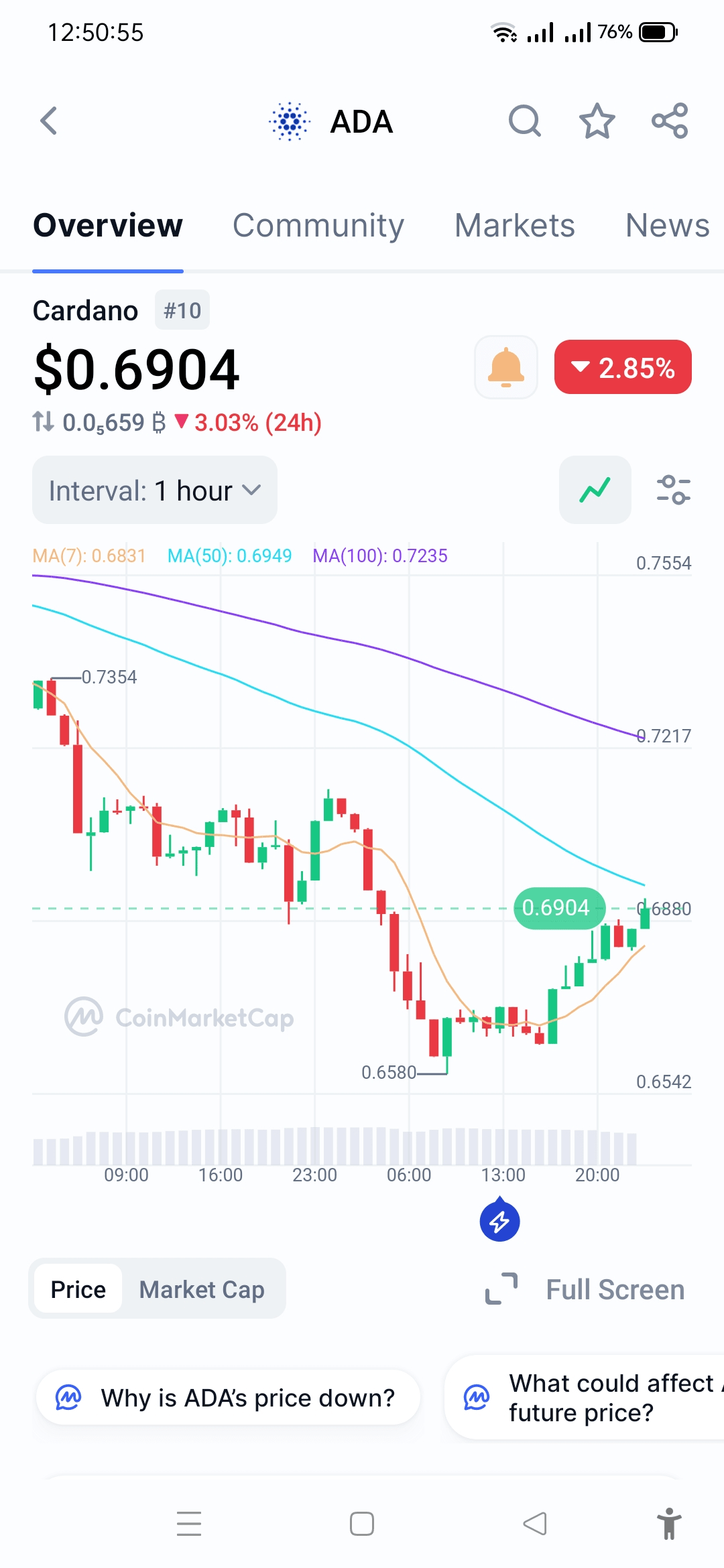 $0.76: $ADA livello di resistenza significativo; superare questo potrebbe indicare un'inversione rialzista.