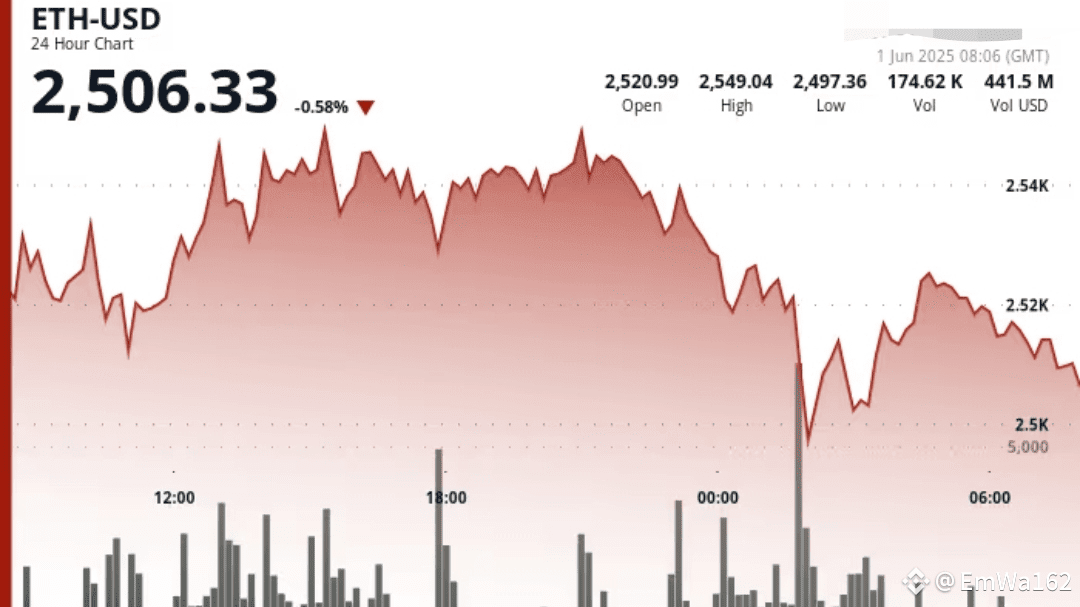 Ethereum (ETH)$ETH ha recentemente sperimentato una significativa volatilità, scendendo sotto la soglia dei $2.500 a causa di preoccupazioni per le vendite su larga scala da parte di grandi detentori, comunemente chiamati "balene". Il prezzo ha toccato brevemente un minimo di $2.499,09 prima di recuperare e stabilizzarsi intorno ai $2.506.