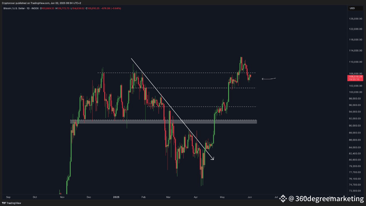 Bitcoin è scambiato a $105.339,83 il 2 giugno 2025. La criptovaluta affronta un livello di resistenza critico che ha mantenuto la sua forza nelle ultime settimane. Un grafico condiviso su TradingView evidenzia questa barriera, mostrando la difficoltà di Bitcoin nel spingersi oltre dopo un forte calo dai suoi recenti massimi.