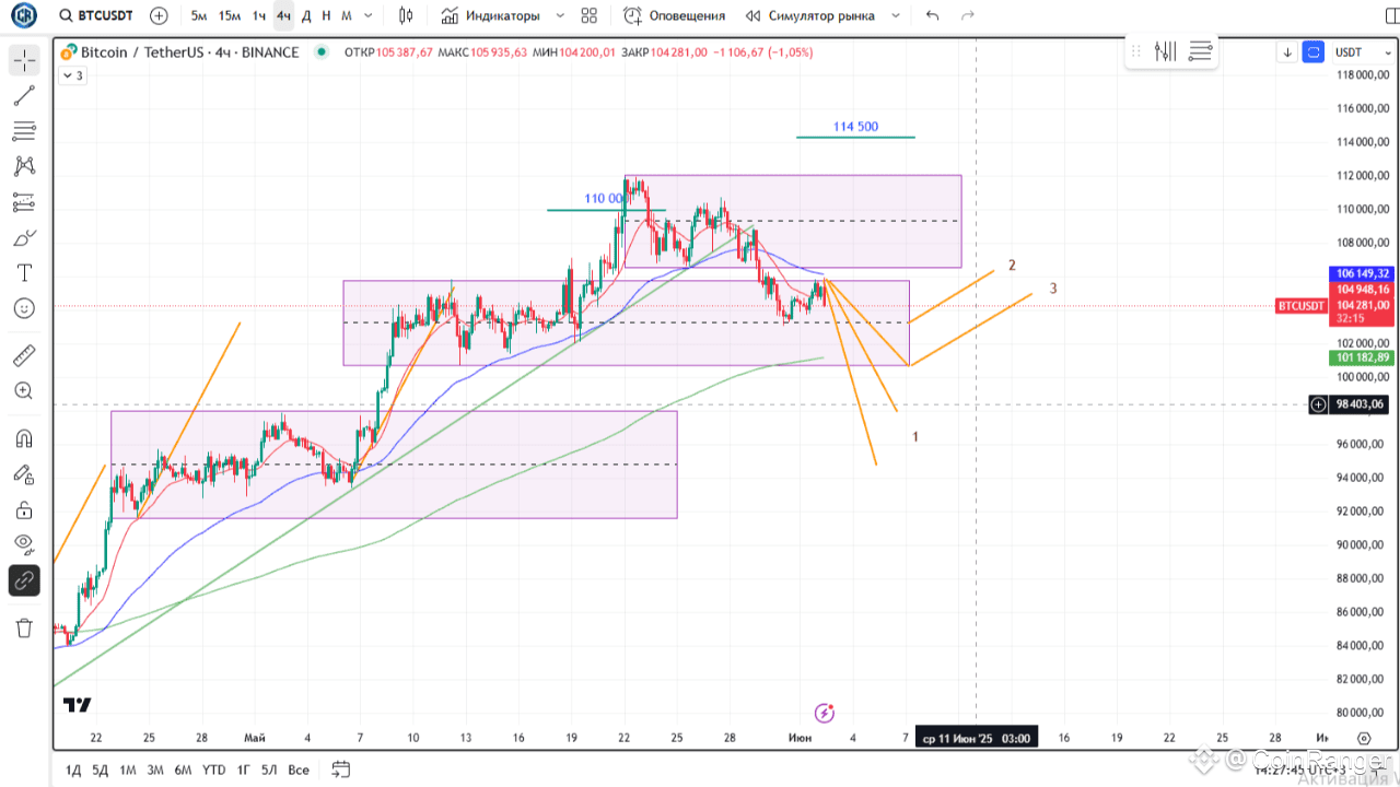 1️⃣ Ventaglio di cadute verso il basso. Nulla ci trattiene adesso dal cadere. Speravo, naturalmente, in un range. E in generale, 106 - 112 rimane un'opzione, ma è già meno probabile rispetto a una diminuzione. Il primo livello probabile di caduta è 101 250 - 100 700. Poi 98 000 - limite superiore del prossimo range. Poi 92 000 - limite inferiore del prossimo range. Circa 92 000, se guardiamo al prezzo di Bitcoin sul mercato CME, c'è un gap (discontinuità di prezzo) - queste cose spesso vengono chiuse. L'ultimo obiettivo è il nostro "scenario catastrofico".