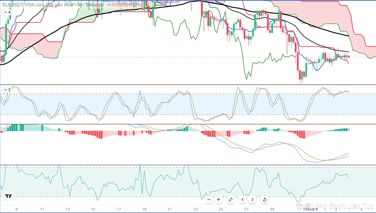 • Il prezzo di SUI sta rimbalzando in una forte tendenza al ribasso, incontrando subito la zona della nuvola e l'EMA che frena.