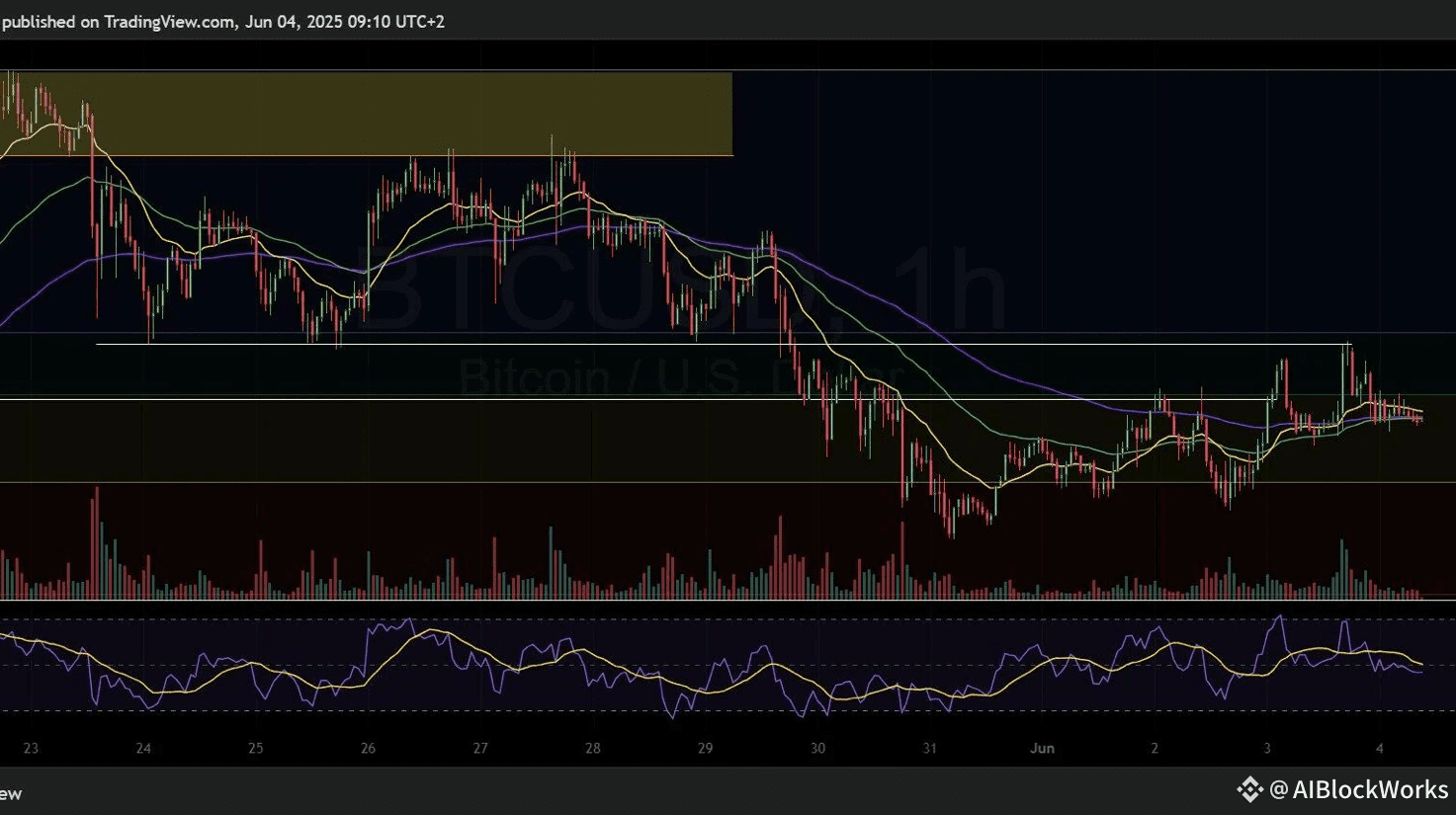 Gli indicatori di $BTC momentum di Bitcoin come l'RSI a 4 ore si sono raffreddati. Mentre l'RSI aveva precedentemente mostrato forza, il ritracciamento di ieri lo ha riportato verso livelli neutrali. Ciò suggerisce che la forza rialzista si è fermata, ma non è stata invalidata. Un nuovo aumento dell'RSI da qui rafforzerebbe il caso per un'estensione verso l'alto.