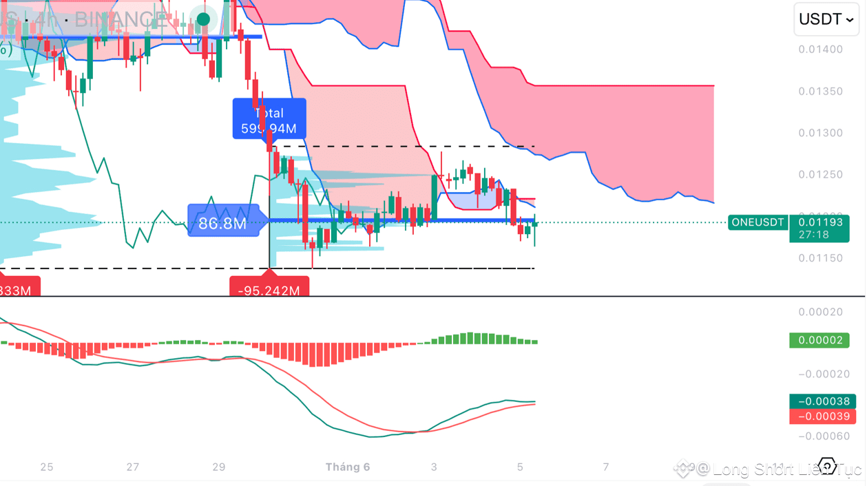 4. Comportamento del prezzo: Il prezzo ha testato più volte l'area 0.0120 senza successo. Questa è un'area di resistenza vicino alla nuvola, c'è alta probabilità di rifiuto e inversione.