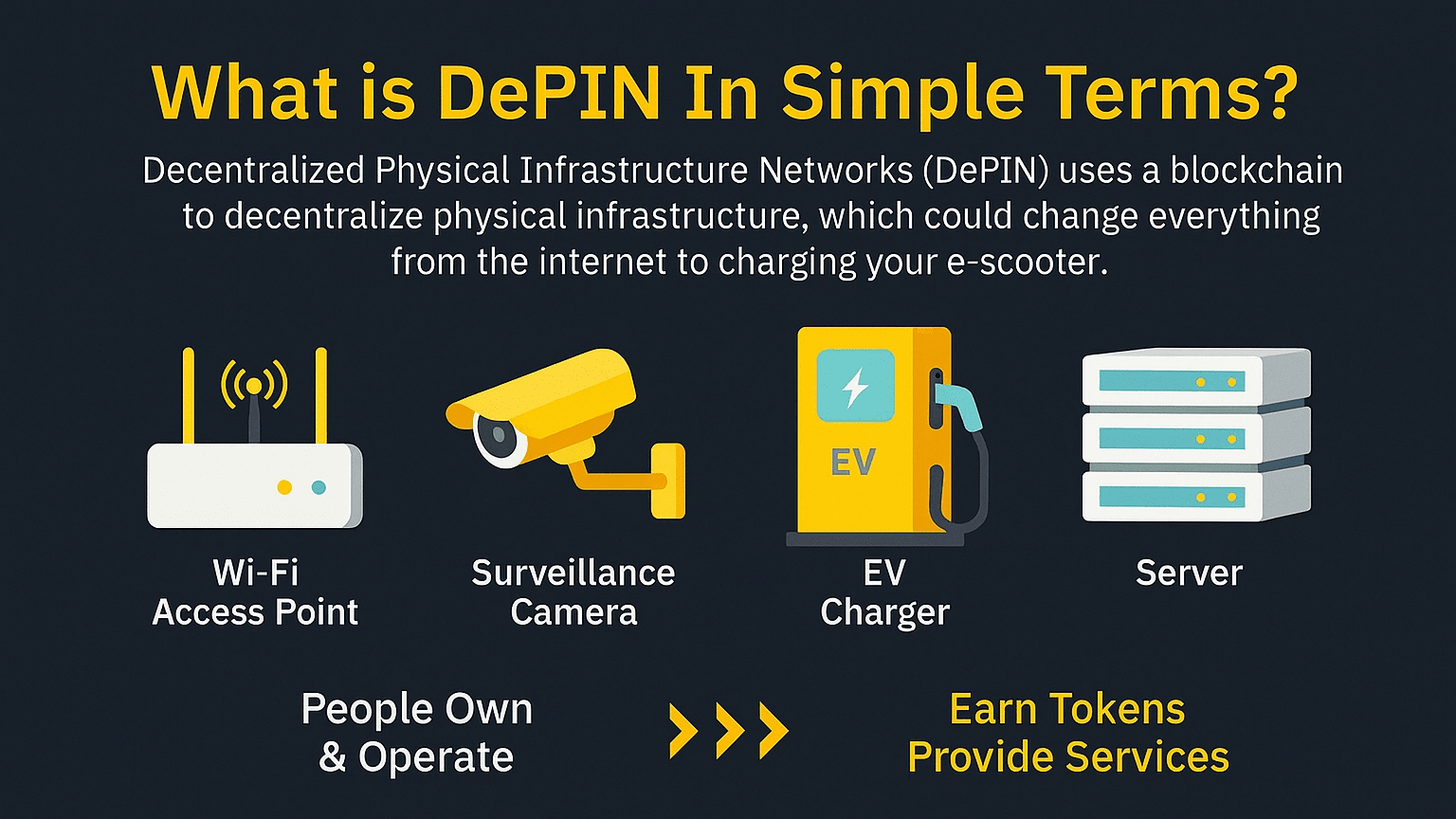 DePIN (Decentralized Physical Infrastructure Networks) è quando dispositivi fisici (server, antenne, telecamere, stazioni di ricarica) appartengono e sono gestiti da persone comuni, non da corporation. E per questo le persone ricevono token.